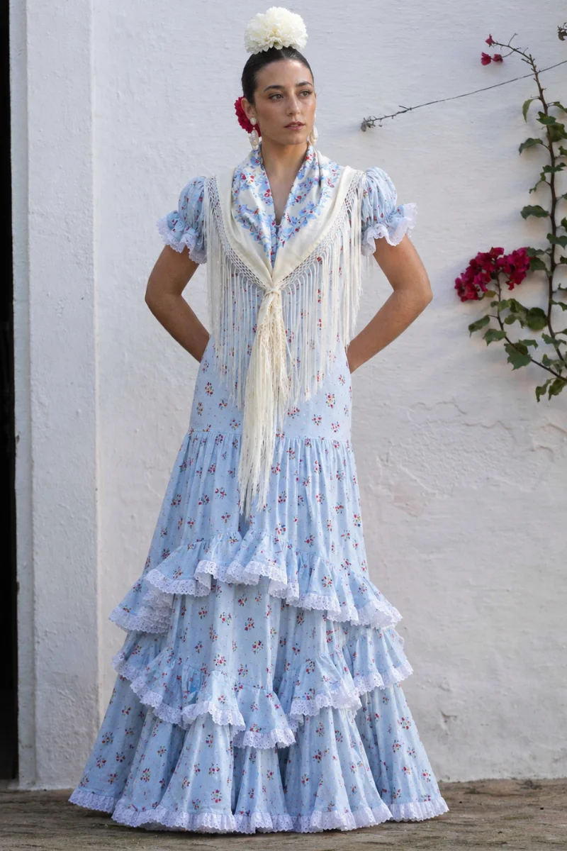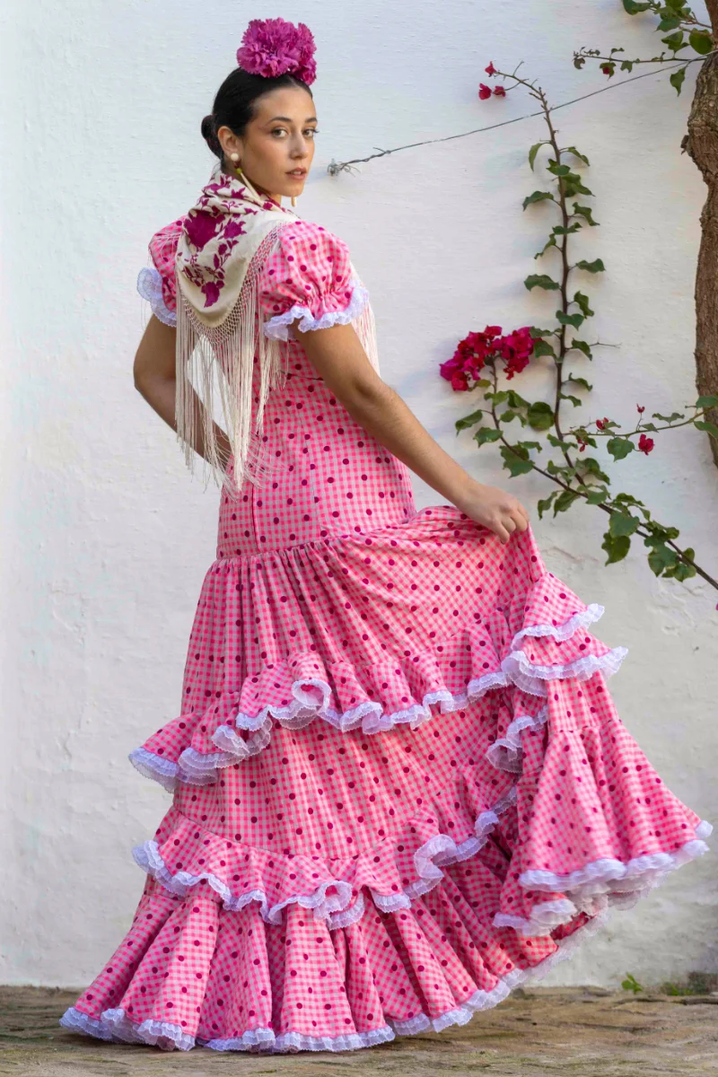 Modelo con manga corta y falda de volantes dispuestos en forma de rombo, incorporando plisado que aporta movimiento al conjunto. Cómodo